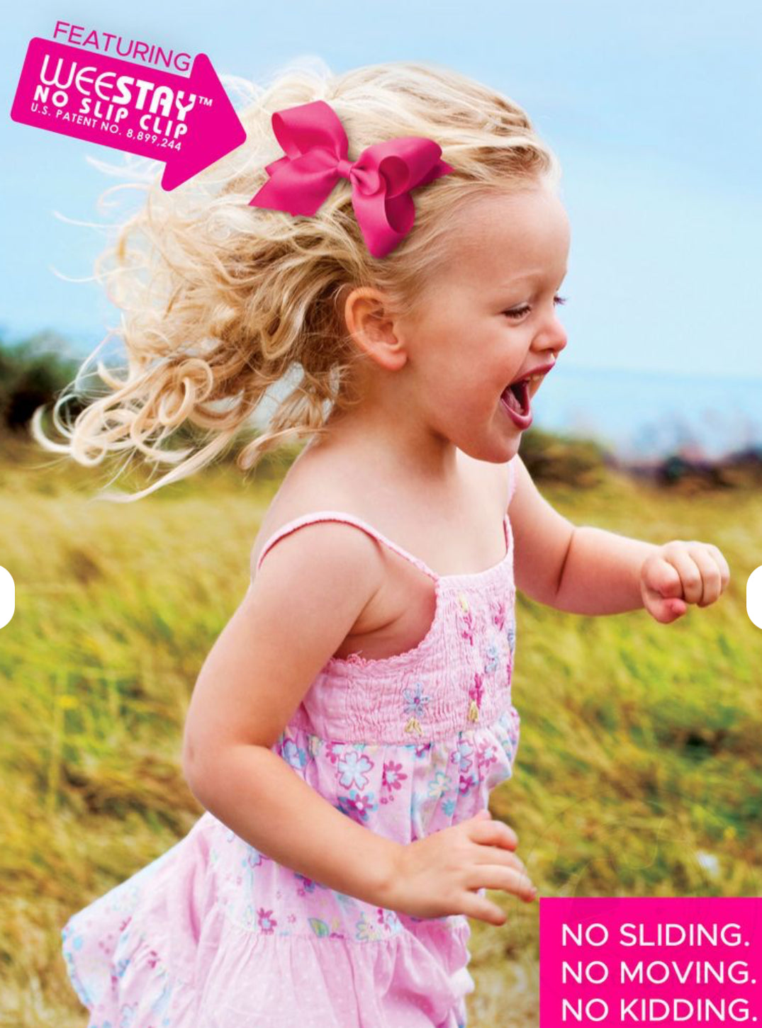 Our classic mini grosgrain hair bow for girls is one of the most popular baby hair bows. Just a touch bigger than our tiny hair bow. These bows are sure to stay in her hair all day with our patented WeeStay™ no-slip hair clip.